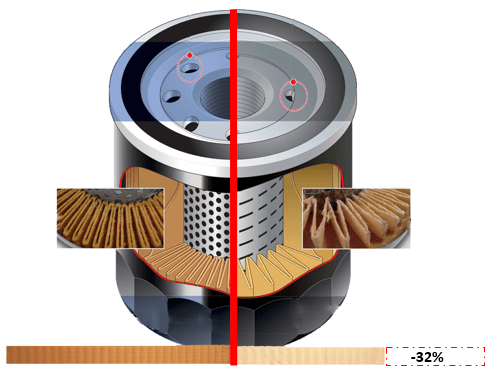 - L’élément filtrant jusqu’à 10% plus court, signifie moins de média et une capacité de filtration réduite